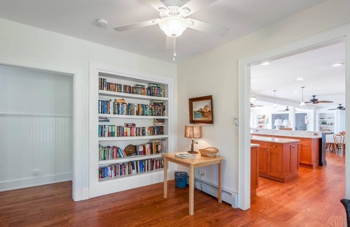 The kitchen has a center island with breakfast bar, and the usual appliances. A separate dining room faces the front of the building, which enjoys wonderful sunlight at breakfast time. The three bedrooms are upstairs, with a king bed in the master, and a private bathroom with a shower. The other two bedrooms (two twins and a queen), share a bathroom that has a tub/shower.