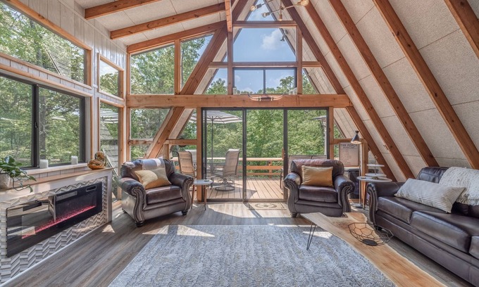 Your perfect woodland retreat awaits at the Honey Bee Inn! This cute and cozy chalet offers the perfect amount of open living space with the most breathtaking views of the Golf Course! Oversized windows surround the living area, creating “treehouse” views of the woods and fairways beyond. Handcrafted with the finest cedar beams and hardwood floors, this rustic design is perfectly outfitted with plush furniture, an electric fireplace with glass ember rocks, modern light fixtures, fully equipped kitchen with custom cabinetry and new appliances, and an expansive, private deck with patio furniture.