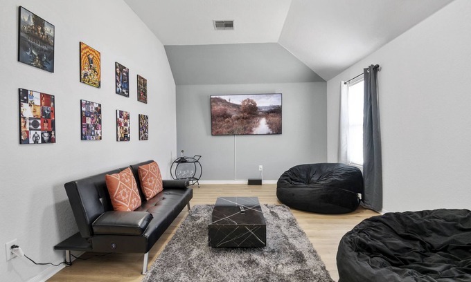 4 bedrooms, 2.5 baths, living (w/ fireplace), dining, kitchen, game w/ smart 85” TV streaming available , Alexa for music, & a dedicated work space.