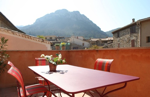 In Drôme Provençale, near Mont Ventoux, the House behind the Fountain is a village house that has kept its soul. It is very comfortable: kitchen, terrace where you eat there summer and winter, living room with wood stove, TV, Internet connection, three bedrooms, one with patio (two with a double bed, one with two single beds) and , in each, shower room and convertible air conditioner. Also at your disposal garage and washing machine.