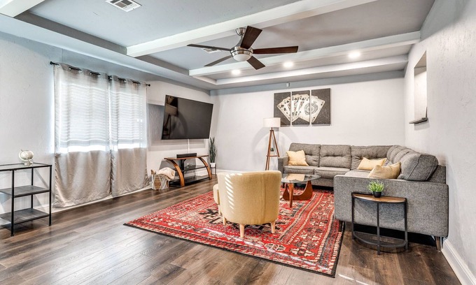 This modern, pet-friendly, veteran-owned home boasts four beautifully remodeled bedrooms that are perfect for families or groups. The open-concept living area features a spacious layout with a comfortable seating arrangement centered around a stunning 75" Smart TV, ideal for movie nights or entertaining guests.