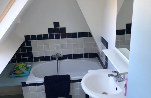 Bathroom with shower on the ground floor, and a bathroom with tub on the 1st floor.