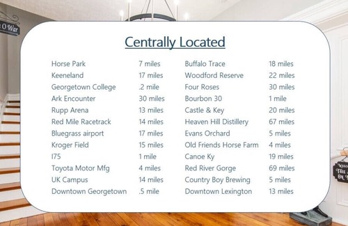 Located on the end of Main Street, you will be surrounded by historic homes and Georgetown College. Enjoy a stroll to Georgetown College, Downtown to enjoy our favorite local restaurants or shop the cutest boutiques, or short scenic drive to Lexington to see the horses or Frankfort to enjoy some bourbon! Guests will be 4 miles from Georgetown College, 7 miles from the Kentucky Horse Park, 20 miles from Buffalo Trace Distillery, 30 minutes from The Ark,& 15 minutes from Lexington.
