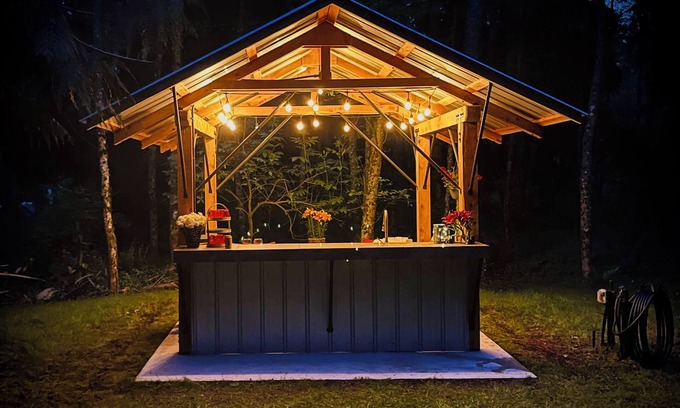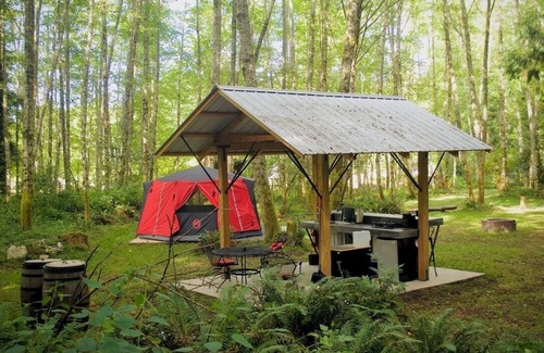 The Huckleberry Glampsite is located on seven private acres at the end of a private road amongst the Giant Western Red Cedars and Alders, 1.5 miles from the Seaside Village of Langley with dining, shopping, whale watching, marina and so much more.