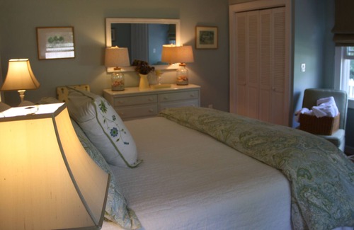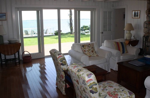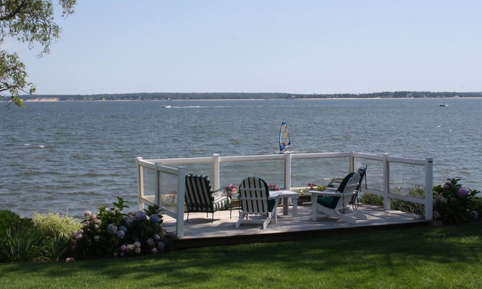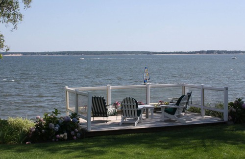For years it has locally been known as the Hydrangea House because of all of its wonderful Hydrangea. Our home is ideally situated at the waterfront end of our 400' deep property overlooking the Peconic Bay. There is a recently renovated master bedroom with a king bed and full bathroom on the main floor tucked in a secluded corner for solitude and relaxation. The rest of the main floor includes another recenlty renovated full bathroom, eat-in-kitchen, living room, family room and laundry room. The kitchen is fully equipped with all new appliances including gas stove top, electric oven, dishwasher, refrigerator and microwave; as well as Calphalon pans, mixer, toaster, food processor, blender, baking pans and fine wine glasses. Everything to enjoy eating at home. Our home has central air conditioning but rarely needs it as a nice breeze comes off the water almost every afternoon. The living room has a working fireplace and large sliding glass doors with the views of the bay. The family room has a large flat screen tv with cable. Both the living room and family room lead to a large 60 foot deck spanning the width of the house. The deck has an outdoor table that seats 8, an umbrella as well as a separate seating area for cocktails and wine tasting. Adjacent to the deck is the gas grill that is connected to the house gas line. The outdoor shower is next to the door to the kitchen.