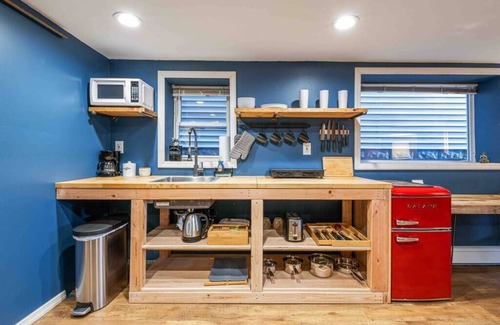 Fresh towels, soap, shampoo/conditioner/body wash, a workstation, tea, coffee, creamers, and your separate entrance (very private).