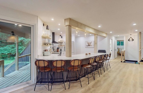 Once featured on HGTV, This unique fully renovated pyramid-shaped home features a stunning midcentury modern design. Inside, you'll find five bedrooms, three bathrooms, a 12-seat movie theater, and an arcade with retro games. Enjoy the spacious living room with a 60-foot ceiling where you can see the peak of the pyramid and four balconies. In the community, you'll have access to lakes, beaches, a ski lift, golf, a game room, a gym, tennis and basketball courts, barbecue areas, and an art center.