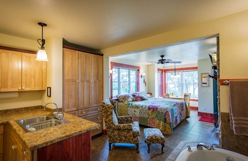 Located only 40 feet from Lake Superior s beach is the Inn at Croftville Road Cottages. This unique and newly crafted building with tall multiple gabled peaks houses 5 vacation suites all with private exterior entrances. The Inn at Croftville Road Cottages #6 provides the gentle sound of breaking waves hitting the shore and spectacular views of Superior. It is designed with romance in mind. This is a smaller one room walk-out ground level vacation suite right next to Lake Superior. One enters this suite from a lakeside patio with comfortable outdoor furniture and then steps up onto a covered entry porch. The room features a king bed centered on the romantic wood fireplace. The king bed can be separated into 2 twin beds upon request. There is a wing back chair and ottoman you can sink into to enjoy the fire. There is also a dinette in the bay window facing the lake. The suite is equipped with firewood, a smart TV and DVD player mounted above the mantle, and a radio/CD player. The spa tub is near the rear of the suite just outside the bathroom but still with a view of the lake as you soak and relax in the tub. Although this is a smaller suite, it nevertheless has a full size and well equipped kitchen in the rear. This four season inn suite is open all year and has wireless internet access. An artesian well provides excellent water for drinking. The Inn at Croftville Road Cottages #6 sleeps up to 2 people with all linens provided.