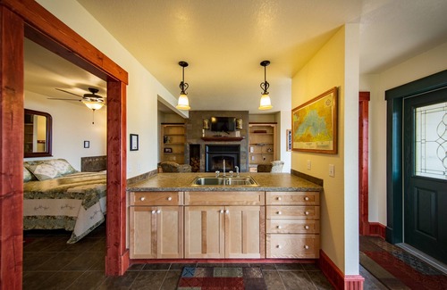 Located only 40 feet from Lake Superior s beach is the Inn at Croftville Road Cottages. This unique and newly crafted building with tall multiple gabled peaks houses 5 vacation suites all with private exterior entrances. The Inn at Croftville Road Cottages #7 provides the gentle sound of breaking waves hitting the shore and spectacular views of Superior. It is designed with romance in mind. This is a large walk-out ground level vacation suite with an open floorplan right next to Lake Superior. One enters this suite from a private lakeside patio with comfortable outdoor furniture and then steps up onto a covered entry porch with large windows looking out to Lake Superior. The dinette is in its own alcove next to the full size and well equipped kitchen. The main room features a romantic wood fireplace straddled by 2 wing back chairs you can sink into to enjoy the fire, a large window seat looking out to Superior, and counter with 4 stools that adjoins to the kitchen. To the rear of the main room is a queen bed and spa tub. Both have a great view of Lake Superior if you wish to relax in bed or soak in the tub. The bathroom area features a large walk-in closet. The suite is equipped with firewood, a smart TV and DVD player mounted above the mantle, and a radio/CD player. This four season inn suite is open all year and has wireless internet access. An artesian well provides excellent water for drinking. The Inn at Croftville Road Cottages #7 sleeps up to 3 people (1 on the window seat and best suited for a child) with all linens provided.
