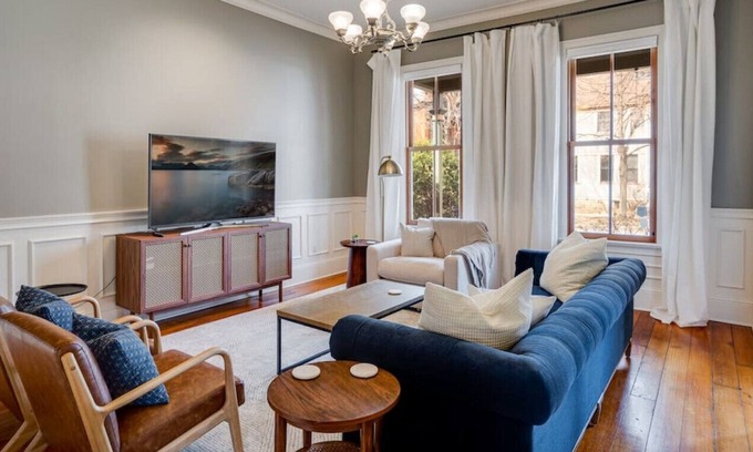 This 140 year old home has been completely updated, while still maintaining its historic charm. At the top if the grand staircase you’ll find a spacious owners suite with a king bed and large private bathroom. There are two additional bedrooms on the upper level (one with a queen and the other with a full bed), a bathroom, and laundry.