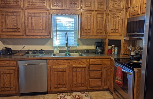 Upstairs we have the living room with dark rustic wood ceilings and original hardwood floors decorated with comfy leather chesterfield sofas ( sleep 2 people if your group has 8), antique coffee table and southwestern pottery/ art/ rugs. The home has WiFi and TV with Roku lets you login to your streaming accounts. There is a stocked kitchen with stainless steel large fridge, dishwasher, and electric range. We provide coffee and tea and spices to get you started, and the little eat-in area seats 2. More seating in the spacious formal dining room with vintage dining set. Access to the backyard is through the kitchen to the large shady fully fenced yard and back patio.