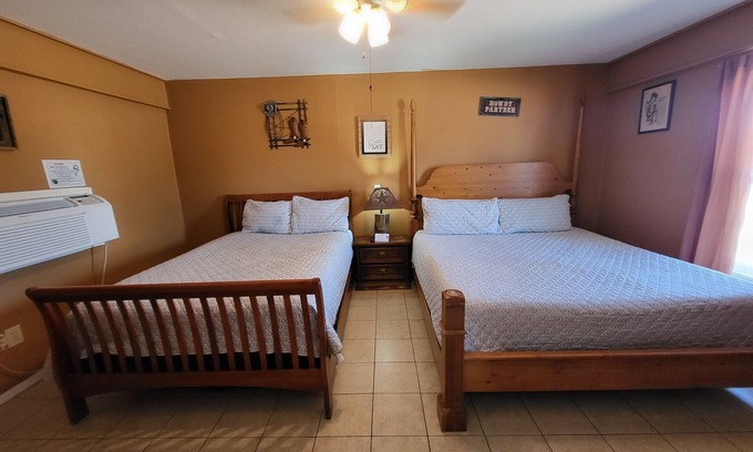 Welcome to the Jesse James Suite, where the legends of the Old West come to life! Step into a room inspired by the infamous Jesse James and the captivating Belle Starr. This spacious suite features a comfortable king-sized bed and a queen-sized bed, perfect for a restful night's sleep after a day of adventure.