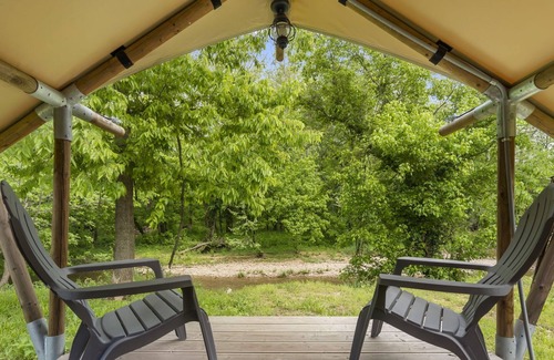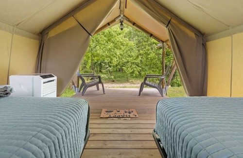 The Jude tent offers two twin beds, and a beautiful porch overlooking the Eleven Point River! Amenities include A/C & heat, a coffee pot, power outlets, a fire pit, and fresh linens! This cozy tent makes for the perfect glamping experience in southern Missouri.
