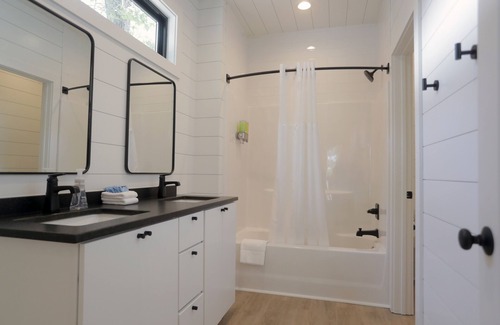 The bathroom boasts a granite dual-sink vanity, tub/shower, and private toilet room. Enjoy our 1888 Mills bath towels, hand towels, and washcloths for each guest. Be sure to bring lake towels as we kindly ask that you do not remove these towels from your cottage. We provide an initial stock of three rolls of toilet paper, hand soap, shampoo, and body wash (we do not replenish these during your stay).