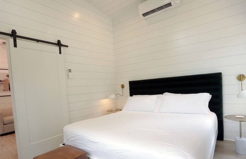 Now for details about the cottage. The Kelsey is a 484 square foot private bedroom cottage that features a king bed with a separate open floor plan full kitchen and living area, accompanied by stylish lighting. The multiple full-length windows allow for fair amounts of natural light.