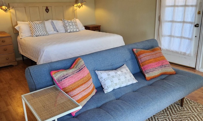 The Casa Hermosa King Suite provides simple luxury for the single traveler or a cozy, romantic nest for a couple. You’ll enjoy a comfy king-size bed beneath a cathedral ceiling, a full bath, a kitchenette, private parking, and a view of Sleeping Lion Mountain from your windows! Just out the door, take advantage of your own flagstone-walled patio. You’ll find a flat-screen TV with complimentary Netflix (plus login to any of your other favorite streaming apps you have an account with) and free wireless. And we’re pet friendly, so bring the pooch.