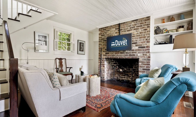 The Space: Welcome to the cozy 1,100-square-foot Kitchen House, a perfect retreat for your next getaway. This charming home offers two comfortable bedrooms, each furnished with a Queen bed for a restful stay. Both rooms are thoughtfully designed with ample closet space, dressers, and windows that provide lovely views of the serene gardens and courtyard.