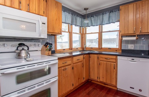Tucked just around the corner, a country kitchen with knotty pine cabinetry is accented with tile backsplash. Your chef friends will enjoy all of the cooking comforts of home while still being able to see waves crash on the shore from the lakeside window.
