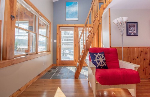Below the loft entrance, a cozy lakeside nook with cushioned chairs and futon is a great spot to curl up with a good book and escape in the afternoon.