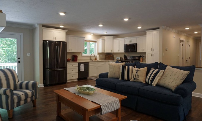 The well appointed kitchen, with black stainless Samsung appliances and gas range, is perfect for preparing delicious meals. There is also a nice, large, outdoor gas grill available for your use. The spacious driveway is large enough to accommodate boat parking. There is a washer and dryer on the property as well as a clothesline for all your wet items after a fun day out on the water. Guests have access to a two-person kayak and paddles. (Guests must provide their own life jackets) The home has 5 Samsung flat screen TV's with Direct TV and 2 DVD players. There is high speed, wireless internet throughout the property. The basement boasts a game table for a friendly game of UNO, etc. or putting together puzzles. You can also enjoy a fun game of ping pong!