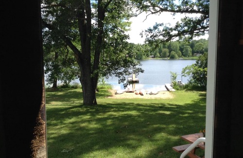 Weekly reservations only during July and the first two weeks of August, Saturday to Saturday. The cabin is one bedroom with a double sofa sleeper in the living room. We are halfway between Hesperia and Walkerville. We are 30 miles from Silver Lake and Lake Michigan beaches. Michigan Adventures is 35 miles from our resort. We are located in a wooded, quiet area with no neighbors. The beach is sandy bottomed. We have a swimming raft with a slide. A campfire pit is next to the lake.