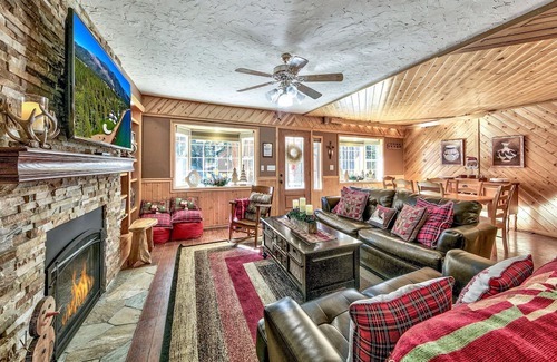 As you enter the cabin you will immediately notice all the custom wood details, the living area with comfy leather couch and chairs is focused on the gas fireplace and flat screen TV. Adjacent to the living area is the dining room. The kitchen is set up for the family chef to prepare a feast, there are plenty of dishes, pots and pans, serving items. There is a slider to the spacious and fenced backyard-perfect for summer bbqs. There is an additional space off the living area with a couch and a TV-a great space for the kids to play. This room does have a futon if you need an extra spot to sleep.