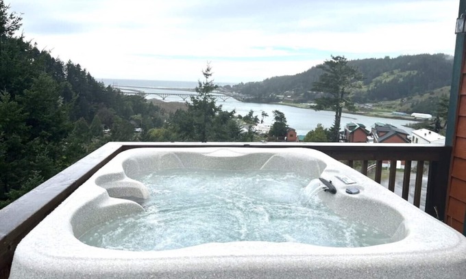 The gateway to the Pacific Ocean, this small cabin at the top of the mountain is just 1 mile from the Pacific's clear blue water. The view is like no other, where the Rogue River flows into the ocean. There is a large spacious deck with a hot tub, perfect for enjoying a nice dinner and a breathtaking sunset. There is one bedroom with a queen bed, an upstairs loft with two twin beds, and a pull out sofa that can sleep two.