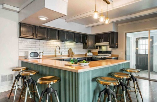 This gorgeous house boasts three cozy bedrooms and two bathrooms. The primary bedroom features a plush king-size bed, while the second and third bedrooms are furnished with comfortable queen-size beds. The basement room has a built-in bunk bed and a sleeper sofa with a new memory foam mattress, ensuring that everyone in your group will have a comfortable place to rest. All bedrooms are outfitted with blackout blinds, extra pillows and blankets, and USB and USBC ports for your devices.