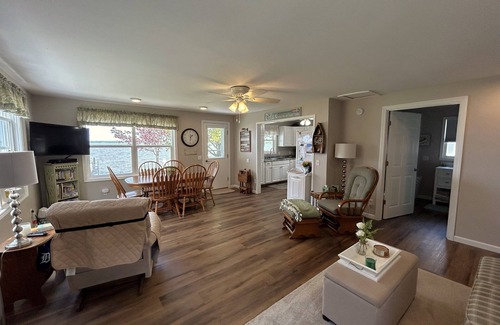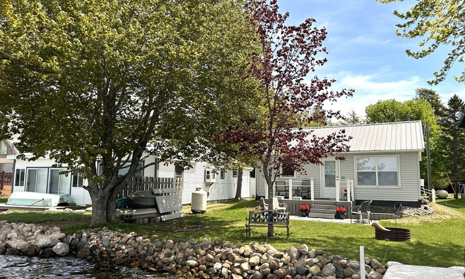 The Lilly pad is a small, 1,000 Sq Ft family friendly cottage located on the east shore of gorgeous sandy bottom- 4400-acre Brevort Lake. Upon entering the cottage you are welcomed by a freshly renovated, light and airy atmosphere. Beginning from the living room and following through to the western side of the home you'll find yourself in a fully equipped kitchen and dining area overlooking Brevort Lake. You will be captivated by the gorgeous lake views 'round the clock. Through the Eastern side of the home you'll find the primary bedroom & attached 1.5 bath on one side of the hall- adjacent from the primary is bedroom #2 which boasts a full size bed and a set of bunk beds. The living room offers a full-size pull-out couch, and a large full bath equipped with a handicap-accessible shower, and washer/dryer. Relax outside around a bon fire overlooking the glistening lake and trailing loons.