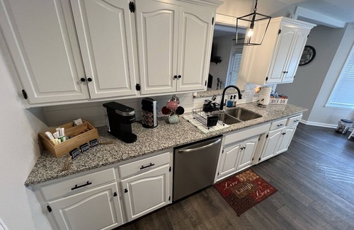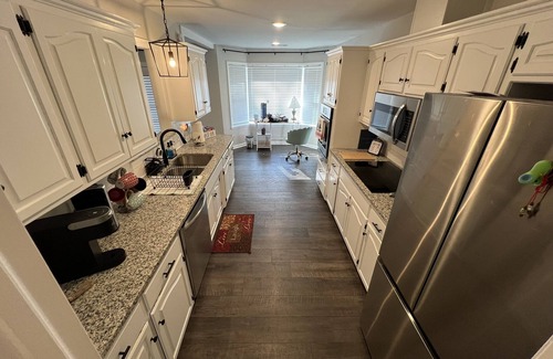 This home includes 3 bedrooms and 1 bathroom. There is 1 Cali King bed, 1 Full bed and 2 Twin beds. There is a full-sized kitchen, dedicated workspace, washer/dryer and a fenced backyard with patio furniture.
