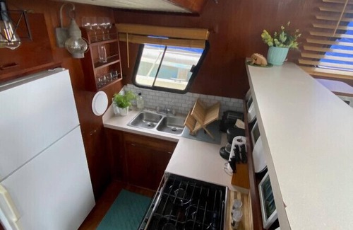This cozy Boatel Yacht called the Lily Pad is a beautiful getaway. This spacious 2 Bedroom sleeps 4 comfortably and up to 6. The Lily Pad sits right in the harbor. The beautiful views of the hillside and marina is sure to bring you a relaxing getaway. There are free kayak rentals included, a beach within walking distance, and plenty of fish to be caught. It has accommodations for 4 people comfortably. Full Kitchen Galley, living area, dining room, queen size bed and 2 single beds.
