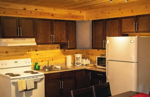 The Lily Pads are a modern construction duplex cabin finished with pine wood. They are connected through the interior and exterior doors making this unit ideal for large families, families traveling together as well as corporate group stays. As there are two full cabins, each side has 2 bedrooms, 1 bath and 1 kitchen.