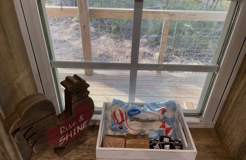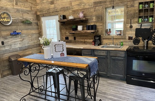 The kitchen has table seating for 4, and a bar space for one more. . Guests can cook their own meal in our stocked kitchen or head to town for several tasty restaurant options. We supply you with fixins’ for S’mores, Folgers coffee, and charcoal for grilling.