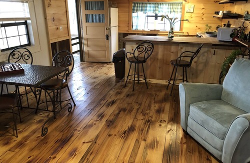 The kitchen has bar seating for 2 and a dining room table to hold 4 guests. Guests can cook their own meal in our stocked kitchen or head to town for several tasty restaurant options. We supply you with fixins’ for S’mores, coffee, and charcoal for grilling.