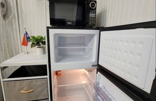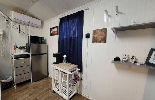 with queen bed, stand up shower, with an endless hot water heater! ac/heater unit. microwave and small refrigerator. keurig coffee machine.