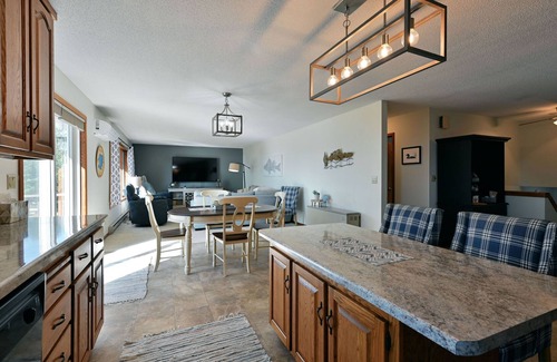 The layout for the Lively Loon lake home offers a main level master bedroom, main floor laundry, spacious kitchen, coffee bar, and a living room with big screen TV. The lower level has a family room, game area, two bedrooms, and a full bathroom.