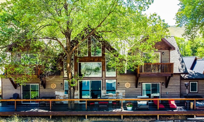 Stunning lodge perched on the banks of the main Salmon River in beautiful Riggins Idaho. Come and relax in our 5 bedroom, 4 bath home and enjoy all the area has to offer. All rooms have coffee makers, and TV's and Wifi. The suites all have access to the main deck or a private deck. Hot Tub, gas grill, gourmet kitchen and more! We are close to all nearby attractions including beaches, rafting, fishing, hiking, horseback riding, hunting & yoga.