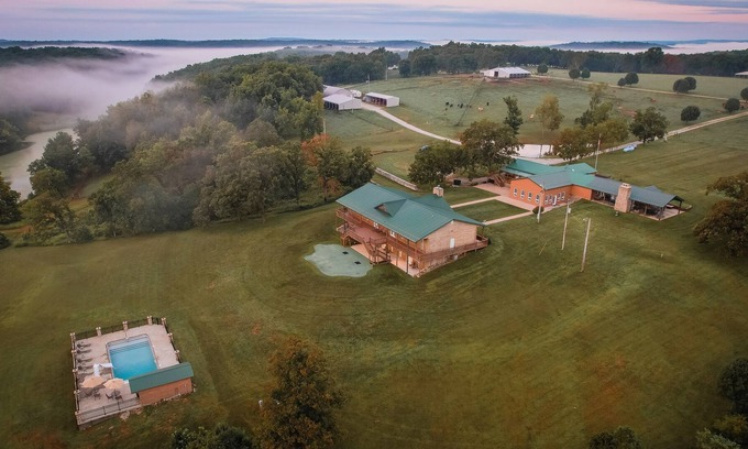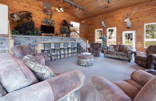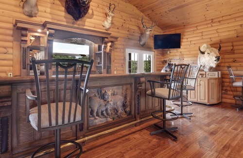 Inside the Lodge you'll discover multiple living and entertainment areas including 14 bedrooms and three cooking and food preparation areas including one fully equipped commercial kitchen. When mealtime comes around, you'll have plenty of space for the group with four dining areas accommodating up to 180. The Lodge has two different gaming and entertainment rooms featuring pool table, shuffleboard, poker table, custom video gaming center featuring XBox Series X & PlayStation 5 Disc. For the grownups, check out the Lodge's incredible Kentucky Bourbon Bar! Hang out there all night with just your crew or ask us over for onsite Kentucky bourbon tastings and hit the road with us for Ozark area whisky distillery & winery tours the next day. These Lodge packages are awesome for bachelor & bachelorette events, couples or singles getaways, & more!