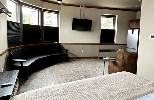 The Lodge Luxury Suites was built in the historic 381 Elks Lodge. Keeping true to the Elks' purpose to serve community and country, The Lodge offers a large area of shared space with a fireplace and the original horseshoe bar, encouraging guests to gather in a self-serving atmosphere. Guests can also enjoy the outdoor common area where you can grill and take in the view or simply relax in our beautiful sauna area. ( A great Finnish tradition)