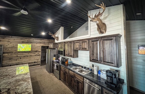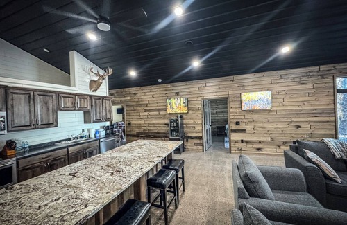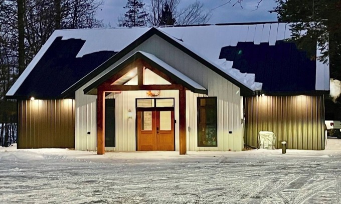 The Lodge was newly constructed in 2024 and offers 4 bedrooms, including 2 rooms with a queen bed and 2 rooms with 2 twin beds each. Each of the bedrooms has its own full bathroom complete with shower, and each bedroom has large windows offering beautiful views of the woods and lake. One bathroom is designed to be handicap accessible. The charming property features a full kitchen with full-size fridge/freezer, dishwasher, stove/oven, microwave, coffee maker, etc. There is a large island with seating for 6. Other amenities include heat, AC, WiFi, smart TV, living room seating for 8+, and a washing machine/dryer. There is a large outdoor patio area with fire pit and Adirondack style chairs for 8, and a grill. Escape to this clean and comfortable Northwoods retreat and experience all this new property has to offer.