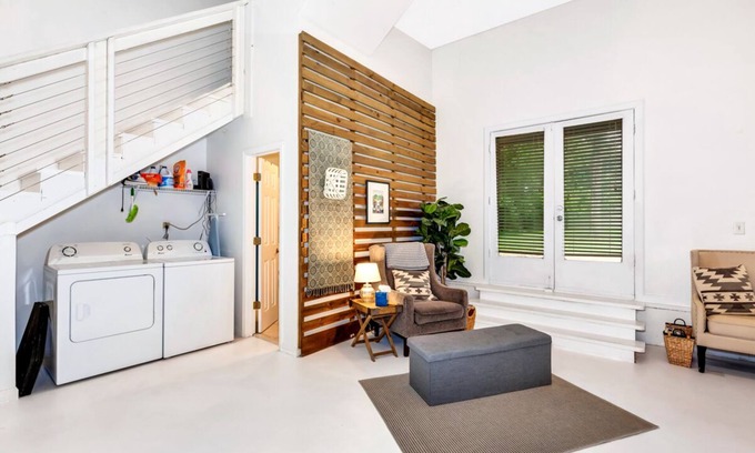 Comes with a full kitchen, Laundry, Bathroom, WIFI, Satellite TV, large Dining table, a private back yard, and Upstairs is the living space with a mini-fridge & Microwave, along with TV and couches/futons, with the hotel style bedroom privately tucked away with black out curtains. Sleeps 4 (on beds) and has fold down futons for a total of 6 people to stay.