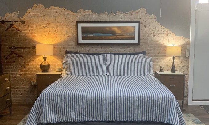 An open space with 20' ceilings, the building was a downtown commercial space until Sally started renovations in 2020. It features a comfy king sized bed, full kitchen, TV with surround sound, leather sectional and full office area for your use. New flooring, fixtures and paint make it a clean space while retaining the LOFT feel.
