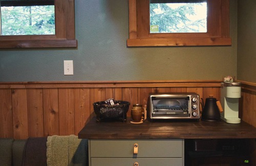 KITCHENETTE: Compostable/burnable paper plates and bowls, plastic utensils, toaster oven, kitchen knives, Keurig coffee maker, electric water kettle, tea, snacks, trash bags, paper towels. **Please note there is no kitchen sink or freezer**