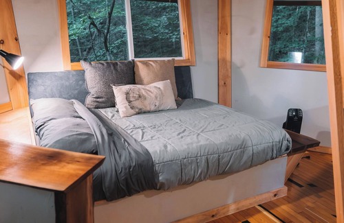 Upon arrival, notice the complete bathhouse and staircase leading up to the kitchen. As you walk across the bridge and find yourself in the kitchen, you will be surrounded by a 360 view looking out into nature through the panoramic windows. Find all you will need to create a feast in this circular kitchen. How does the flow of cooking compare to a square? From the kitchen, exit across the second bridge and relax outside on the fully suspended deck. You can enjoy your morning coffee here, rain or shine, because it is protected from the elements by the bedroom above. When the sun sets and the whippoorwills come out to sing, you can climb upward from the deck, and enter the bedroom through a hatch in the floor. This cozy, octagonal bedroom, is a place to lounge or sleep outfitted with giant floor pillows, two full sized beds and one twin-sized fold out sleeper sofa.