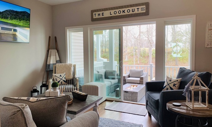 Inside on the main floor, the house’s modern farmhouse design features an open floor plan, sitting room, and kitchen area. The sitting room features a 65-inch smart TV with Spectrum Cable. The open floor plan is perfect for board games, reading, listening to music, relaxing around the outdoor gas fire pit, or taking in the beautiful views of the lake. The open kitchen, which is the ideal place for cooking, has plenty of countertop space and includes a large refrigerator with freezer (and ice maker), an oven, a stovetop, a dishwasher, a microwave, and coffee maker (both drip and Keurig). For meals, you can dine at the 6-person dining table with a place for 3 at the island or hang out in the large covered deck with comfortable outdoor seating area around the fire pit overlooking the lake.