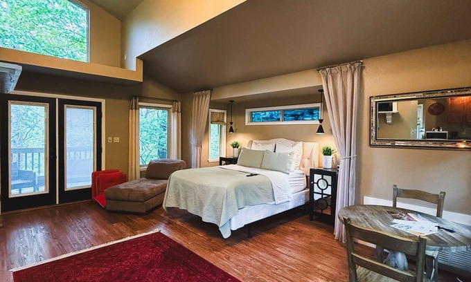 Escape to the treetops at Grand Treehouses, where modern luxury meets nature’s embrace. Featuring elevated walkways and exquisite design details, including stained-glass windows, hardwood floors, gas fireplaces, and chandeliers. Unwind with premium amenities: a wet bar, 50" flat-screen TVs, free Wi-Fi, a plush King bed with luxury linens, cotton towels, a Jacuzzi tub for two, a glass walk-in shower, heated towel racks, a hair dryer, heated towel racks, and heat and air.
