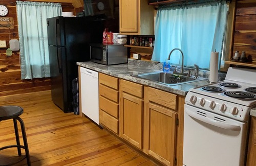 The kitchen is fully equipped with everything you need to prepare any meal. Our goal is that you will only need to bring your food. The bath has a beautifully designed walk-in tiled shower with a removable shower head, and shampoo, conditioner, and body wash are provided in the shower. The cabin is meticulously cleaned and sanitized before your arrival.