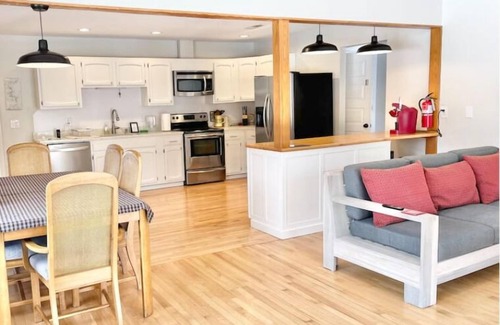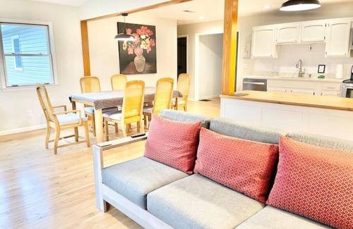 Offering an entire home for the family. The home provides a formal living area with a TV, open concept family room with kitchen and dining area, private office space for remote workers with additional twin sized bed, 3 bedrooms each with a queen sized bed, and 2 full bathrooms. The family rooms opens up to a spacious deck and an open backyard. The basement is an open space with a pingpong table, dart board, and card table for gaming. Attached as the laundry room with washer and dryer.