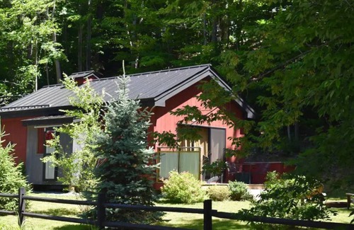 'The Maple Moose' is a new one bedroom, small house on the edge of Quechee village. The sugar shack inspired design evokes a woodsy chic atmosphere while providing all the luxuries and comforts of an upscale vacation retreat. The space "The Maple Moose" was designed and built to be a luxury, modern version of the old sugar shacks of Vermont. On entering the house through the porch you will be in the living space with vaulted wood ceiling and rough hewn hemlock posts. There is smart TV for streaming your favorite Netflix or Prime shows (no cable) and a Bose stereo sound system. If you'd rather make your own music, we include a rather nice acoustic guitar. The large sliders open on to a well-proportioned deck with outdoor dining and casual chairs for enjoying morning coffee. The kitchen features luxury stainless appliances as well as a Keurig coffee maker, island and dining table. Through the large wood barn door is the bedroom with en-suite bathroom. There is ample closet and storage space. The bathroom has a glass door shower and water-sense rain shower. Outside there is plenty of parking space. Trees and shrubs surround the house, giving the impression of being in a secluded wood while at the same time being within walking distance of some of the most popular Vermont attractions. We have recently added air conditioning and an electric log fireplace. A little way from the deck is a fire-pit for those frosty fall evenings. Another addition is "The Smiling Moose Cocktail Lounge & Bar". We had a spare shed lying around (as you do!) and installed it at the top of our property. You can access this by the steps and path (at your own risk). There is a deck, some chairs, coffee table and other nick-nacks to make this a quiet wooded retreat. It's a special pace for a morning coffee or an evening cocktail - BYOB! We welcome one 'best dog in the world' for a pet fee of $50. Please don't allow pets on the furniture or the bed and don't leave them alone in the house. If your furry friend sheds, please clear up any excess dog hair. Failure to do this will result in an extra cleaning charge. Please note that we do not allow the charging of electric vehicles. I believe there is a charging station at Jake's Market on rt4. Please contact owner to discuss longer rentals. Additional rules: Please leave skis and snowshoes in the porch. Winter boots should be left at the entrance, please. This house is suitable for couples or single adult guests. We cannot accept more than two guests.
