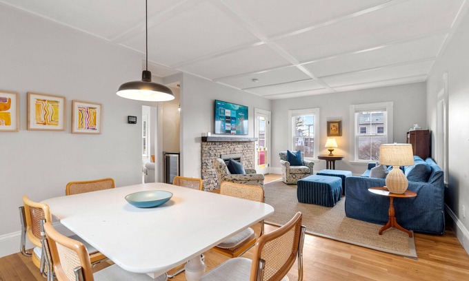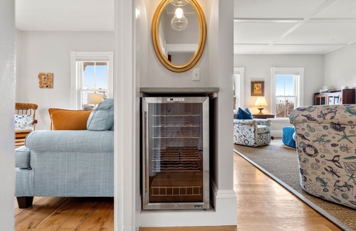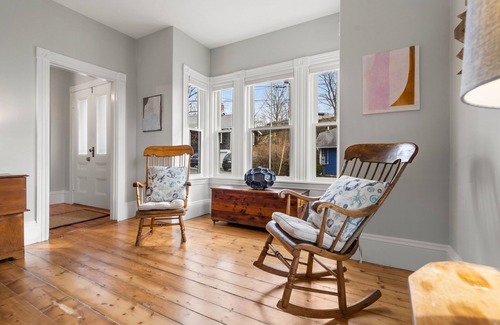 The second bedroom is fitted with a queen-size bed and the third bedroom has two twin beds. All bedrooms have blackout window treatments so you can enjoy a peaceful night's sleep. You'll also find a common area set up for a remote workspace perfect for your "work-cation". All of these cozy spaces are filled with New England charm like original hardwood floors along with added modern conveniences!